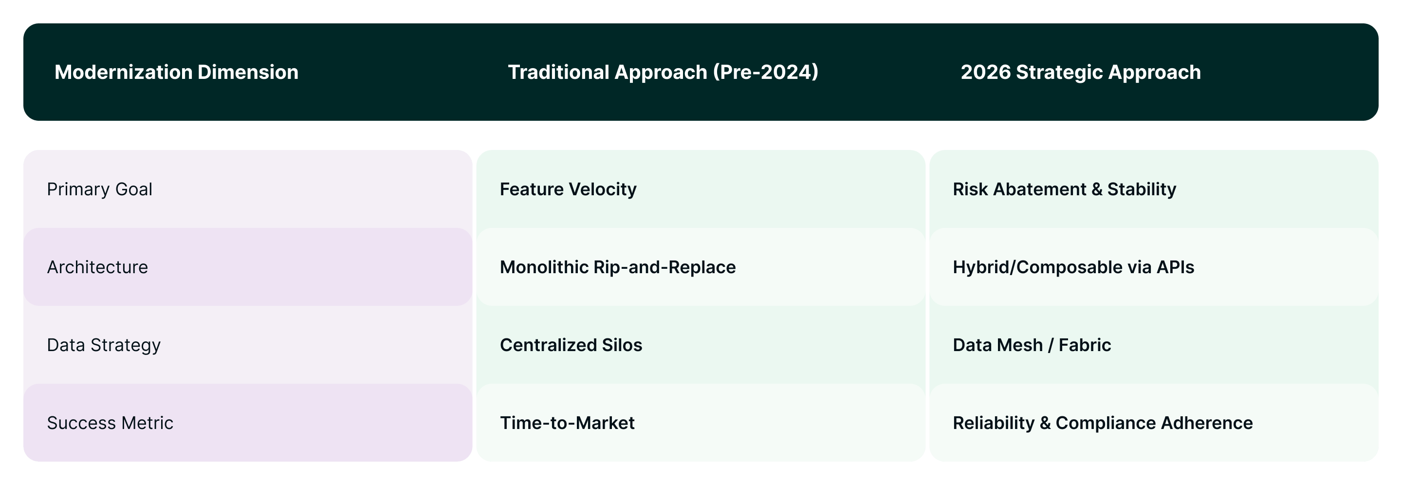 - Pivoting to Hybrid Architectures: "Big-bang" replacements are regressing. Modern strategy favors the "Strangler Fig" approach, using API-first architecture as a mandatory risk-management framework to decouple fragile monoliths.